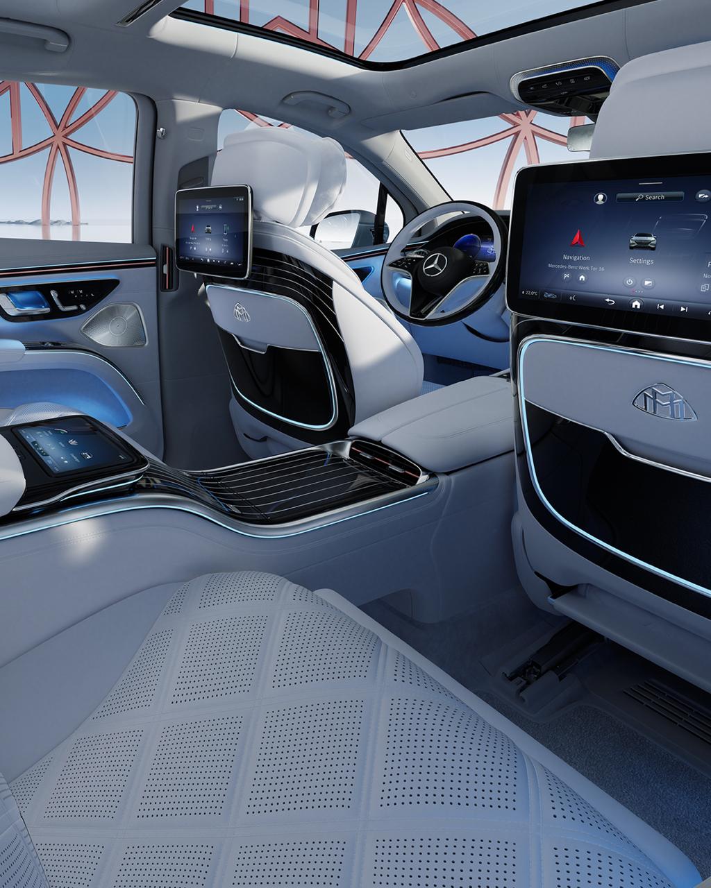 وتوفر المقصورة الخلفية أيضًا أقصى معايير الراحة مع مقاعد مريحة وفخمة توفر وظائف التدفئة والتهوية والتدليك، بالإضافة إلى تدليك الساقين. وتتضمن باقة المقاعد الخلفية First-Class ووضعية السائق الخاص عددًا من المزايا الأخرى، مثل الكونسول المركزي المزود بحامل أكواب حراري وشعار مايباخ المضيء. ولتجربة أكثر حصرية، تم تزويد التصميم الداخلي بإضاءة محيطية قابلة للتعديل، ونظام ENERGIZING AIR CONTROL Plus، ومزايا أخرى مثل وحدة التبريد والطاولات القابلة للطي.