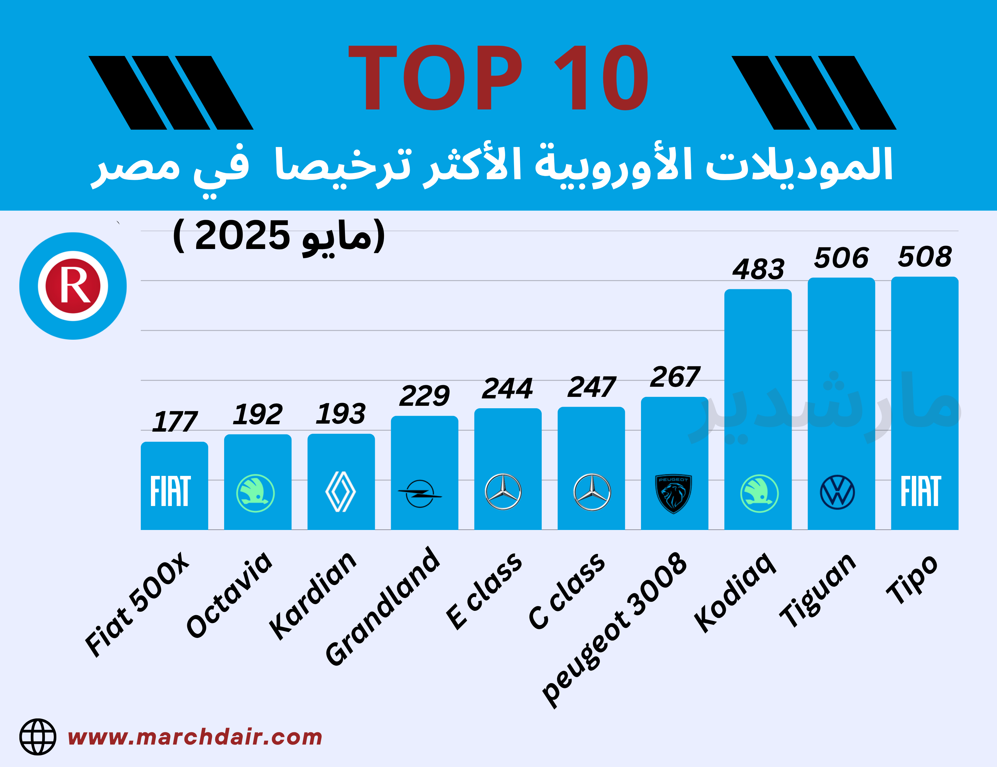 تراخيص العربيات الأوروبية في شهر مايو تصدرتها فيات تيبو بـ508 عربية، وفيات 500x جت في الترتيب العاشر من الـTop 10.