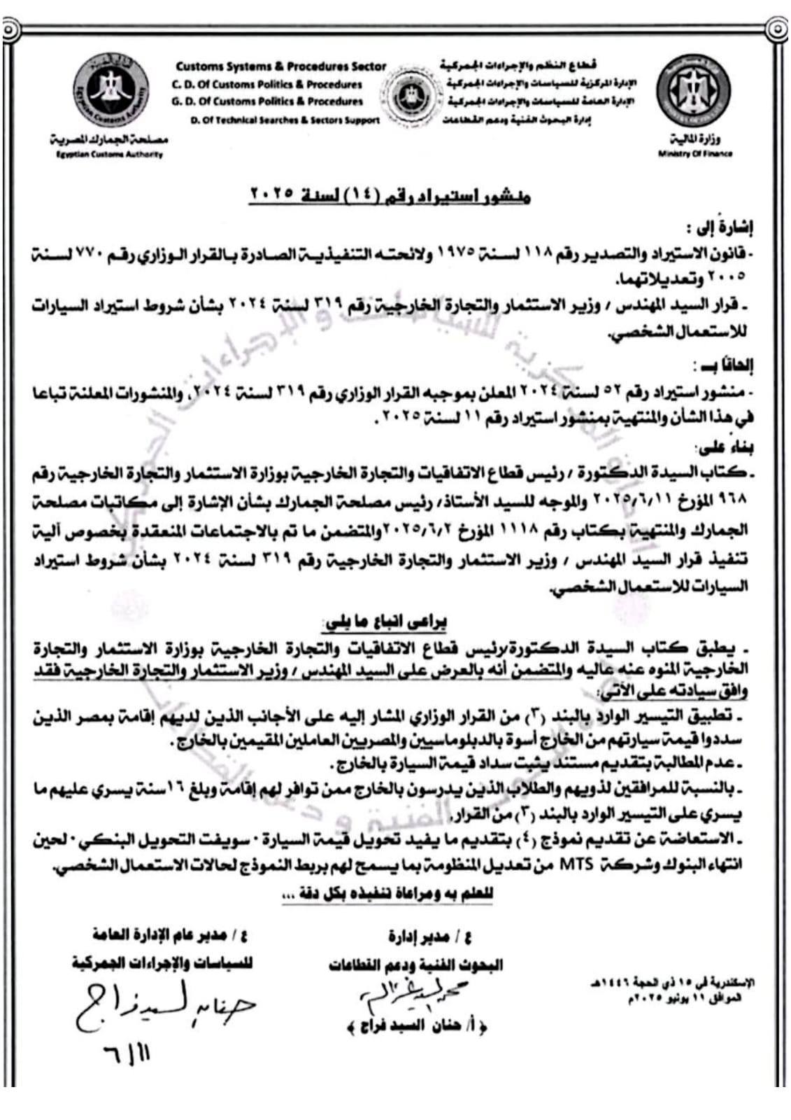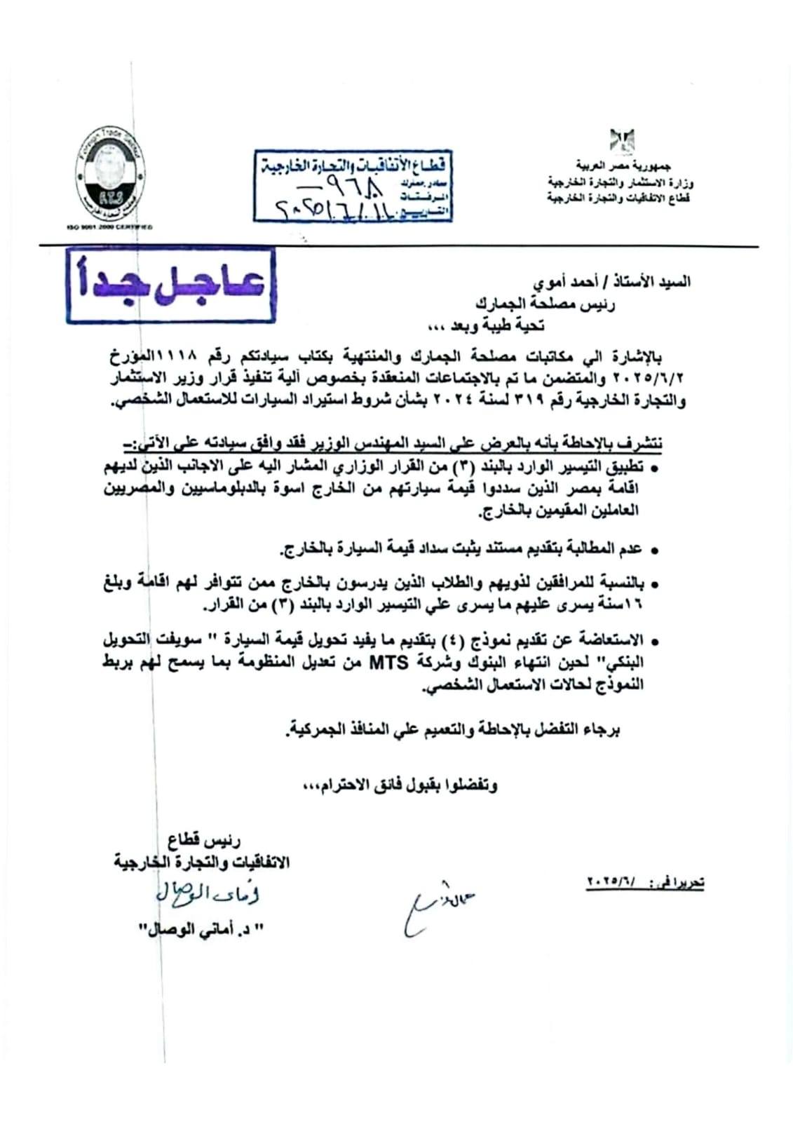 تم تداول منشور خاص بالجمارك المصرية ووزارة الاستثمار والتجارة الخارجية , حيث جاء في المنشور أنه جاء بناء علي المشاورات بين الجمارك المصرية ووزارة الاستثمار بخصوص آلية تنفيذ قرار وزير الاستثمار والتجارة الخارجية رقم 319 لسنة 2024 بشأن شروط استيراد السيارات للاستعمال الشخصي.
