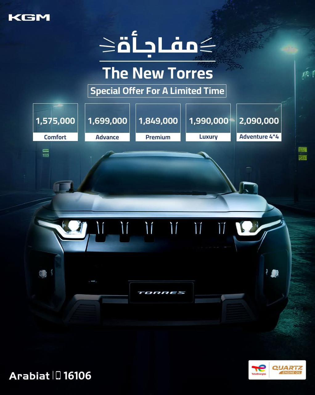 أعلنت شركة "عربيات إيجيبت"، الوكيل الحصري لعلامة KGM الكورية في السوق المصرية، عن تخفيضات استثنائية على طرازات "توريس 2025"، وذلك في إطار استراتيجيتها لدعم القوة الشرائية للمستهلك وتوسيع قاعدة عملائها في سوق السيارات متعددة الاستخدامات SUV.