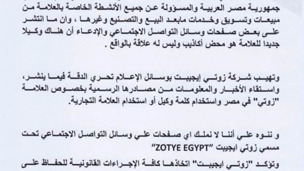 بيان رسمي.. زوتي ايجيبت تحذر من استخدام اسمها والعلامة التجارية
