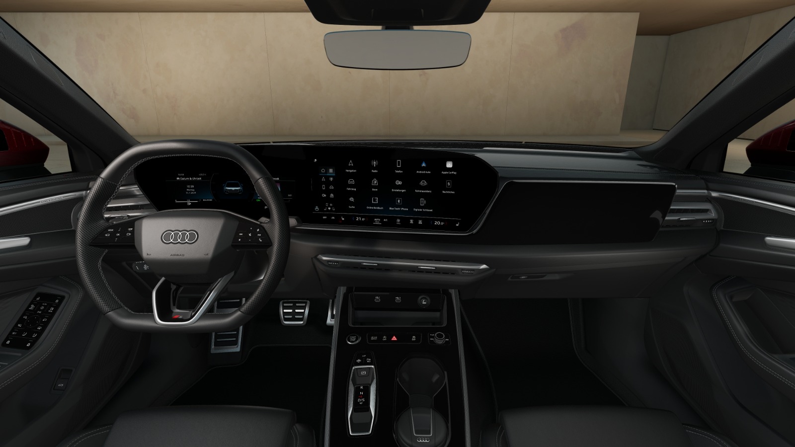 وبالانتقال إلى المقصورة الداخلية، نجدها تختلف في تصميمها بشكل كبير عن مقصورة الطراز السابق؛ فهي تتمتّع حاليًّا بتصميم متطوّر يغلب عليه طابع البساطة مِن دون تكلُّف، إلى جانب الاستعانة بمجموعة كبيرة من الأنظمة الإلكترونية والشاشات المتنوّعة. وبمجرد دخول السائق إلى المقصورة الداخلية تستقبله الجلود الفاخرة على أكثر من موضع، والأسطح التي تُغطيها الألياف الدقيقة، والتطريزات المميّزة، وأيضًا الزوائد الجذّابة سوداء اللون. وعلى الصعيد التقني، هناك شاشة بانورامية منحنية تضم شاشة عالية الوضوح قياس 11.9 بوصات للوحة العدَّادات (Audi Virtual Cockpit Plus) وأخرى قياس 14.5 بوصات عاملة باللمس. وهناك كذلك الشاشة الزجاجية الأمامية المحسّنة التي تعرض المعلومات الحيوية Head-Up Display والشاشة الإضافية أمام الراكب الأمامي قياس 10.9 بوصات.