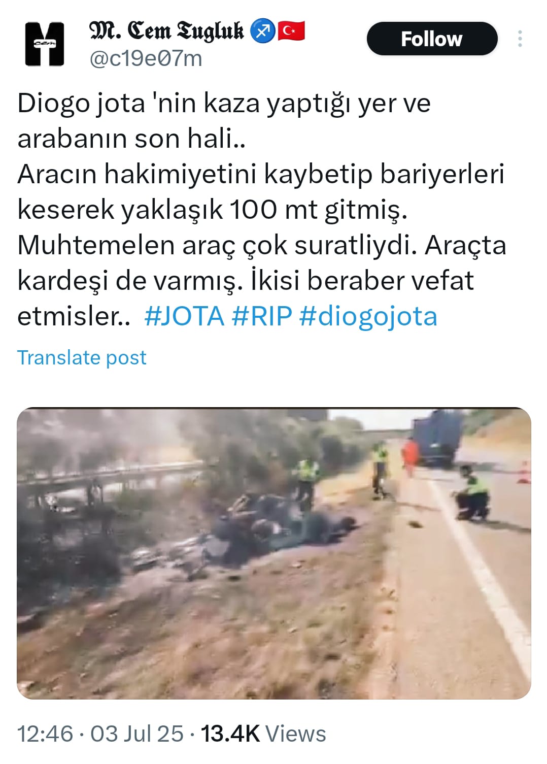 ونشر احد حسابات منصة اكس لاستاذ في جامعة مرمرة الاسبانية صورة يزعم انها لحادث جوتا ووصف للحادث حيث قال انه تم فقد السيطرة على المركبة واصطدم بالحواجز ليواصل السير لمسافة 100 متر تقريبا، مما يرجخ ان السيارة كانت تسير بسرعة حنونية