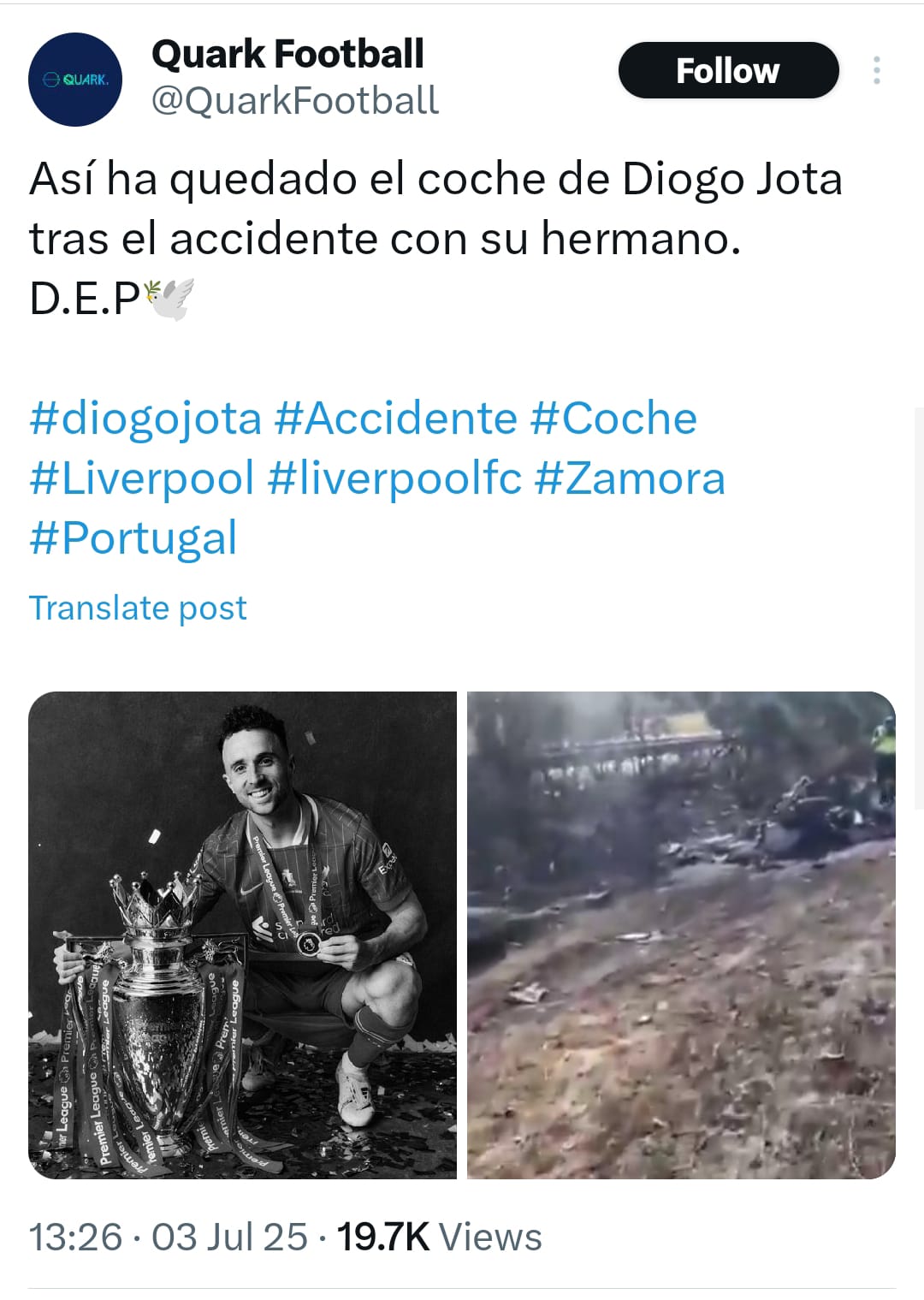 في حادث سيارة مروع لقي لاعب نادي ليفربول والمنتخب البرتغالي دييجو جوتا وشقيقه اندريه مصرعهم في إسبانيا فجر اليوم، تحديدًا في مقاطعة زامورا، على الطريق السريع A-52، بالقرب من بلدية Cernadilla، حيث انحرفت السيارة التي كان يستقلها جوتا وشقيقه أندريه عن الطريق واشتعلت فيها النيران، مما أدى إلى وفاتهما في موقع الحادث.