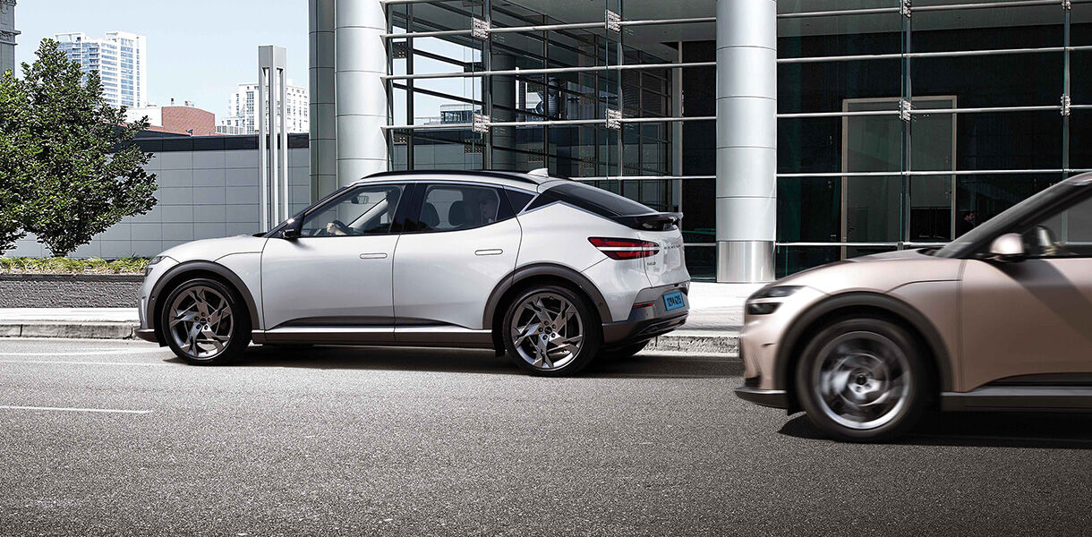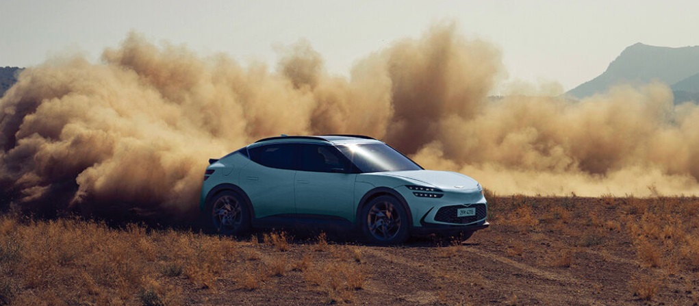 يتميز التصميم الأمامي بمصابيح "مزدوجة "، لتكمل تصميم هيكل السيارة الأنيق والعريض. ويُعد تصميم "تو لاين"، الأيقوني والسهل التعرف عليه، رمزًا لسيارات جينيسيس. وينخفض مستوى شبكة "كريست جريل" المميزة لسيارات جينيسيس إلى مستوى أدنى لتلبية متطلبات التبريد الخاصة بمنصة السيارات الكهربائية عالية الأداء. وهي تفصيلة خاصة بالسيارات الكهربائية تُبرز انتقال جينيسيس إلى عصر الاستدامة.