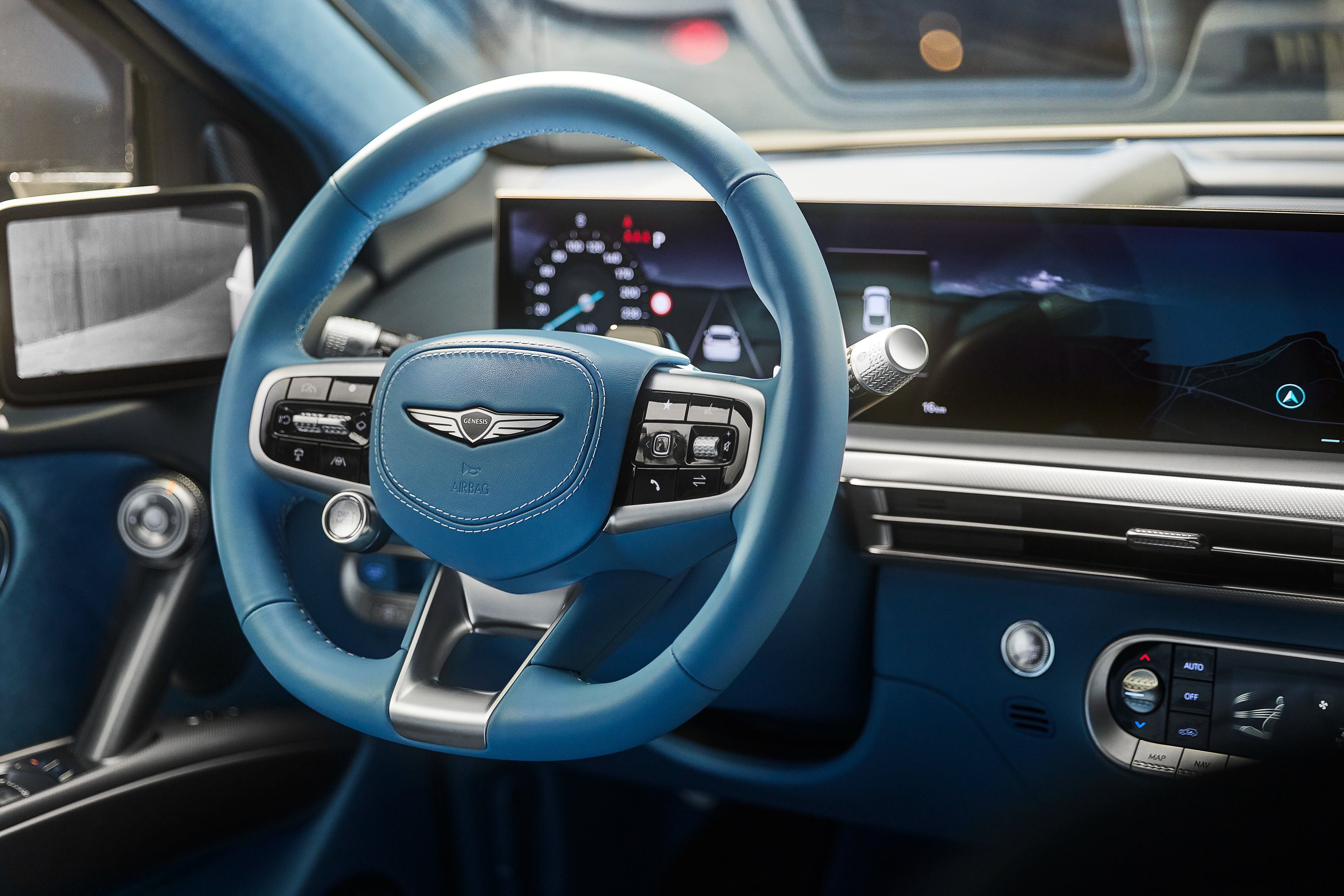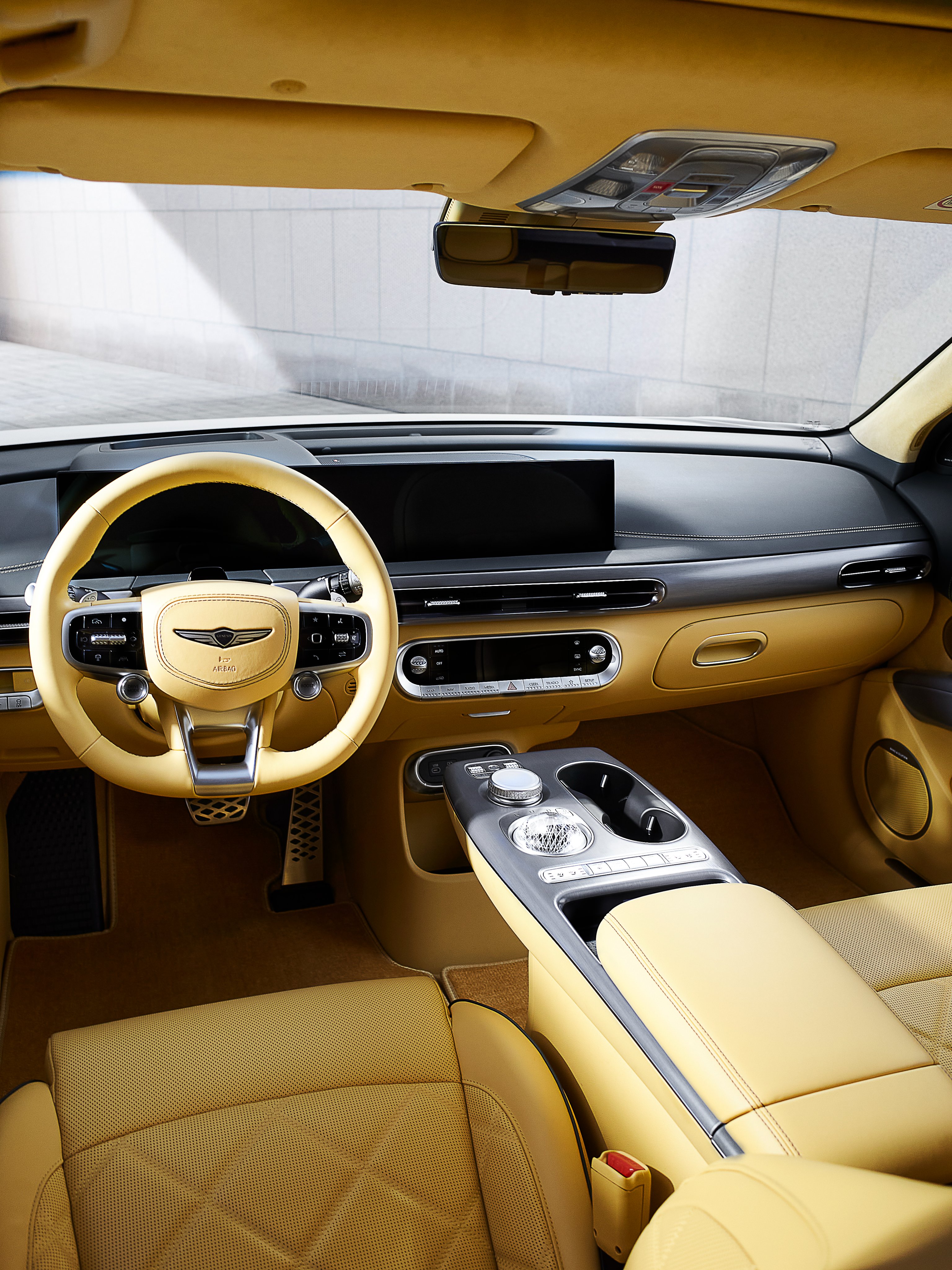 وفي الداخل, يتوفر لها ناقل حركة إلكتروني كريستالي ووحدة تحكم جينيسيس متكاملة ومبدلات تحكم متجددة ومرآة رؤية خلفية كهربائية بدون إطار ولوحة تكييف تعمل باللمس واضاءة محيطية اختيارية ومصباح سفلي متزامن مع الاضاءة المحيطية ومصابيح ليد تحت المقعد الأمامي وعتبات معدنية. كما يتوفر لها مقاعد جلد اصطناعي ومقعد السائق قابل للتعديل كهربائيًا في 12 اتجاهًا، مع دعم أسفل الظهر ومقعد الراكب الأمامي قابل للتعديل كهربائيًا في 8 اتجاهات، مع تعديل الارتفاع ومقعد أمامي مزود بالتهوية ومقاعد الصف الثاني قابلة للطي بنسبة 4:  و6 نزام ccIC أي امقصورة القيادة المتكاملة للسيارة المتصلة ونظام صوت Bang & Olufsen مزود بـ 17 مكبر صوت.