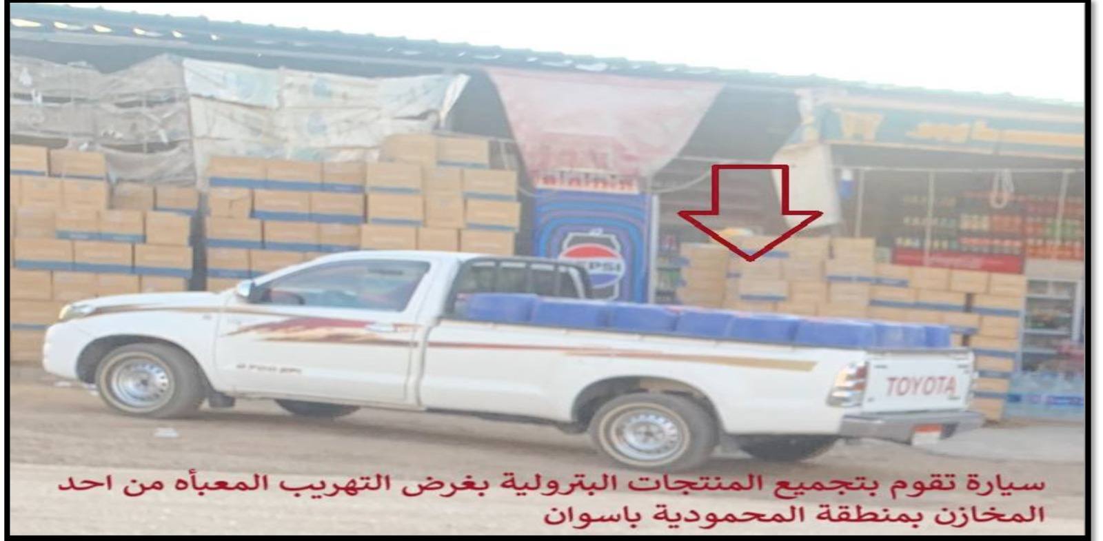 وجري ضبط وكر بمنطقة الحكروب بمدينة أسوان وبه  عبوات معبأة بمنتج السولار بعدد 85 برميلاً بسعة 60 لتر للبرميل، والمتحصل عليها بشكل غير مشروع بهدف التهريب ، علاوة على ضبط عدة سيارات بيك أب وجامبو ومنها سيارات بدون لوحات معدنية محملة ببراميل معبأة بمنتجي السولار والبنزين المتحصل عليهما بشكل غير مشروع.