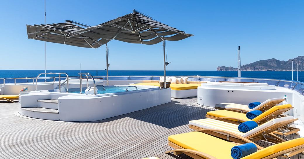 وحول المناطق الخارجية من اليخت، توفر صالة الألعاب الرياضية المكشوفة المجهزة بالكامل تمرينًا مع نسيم البحر، في حين توفر منطقة الصحة المخصصة غرفة بخار وحوض العلاج المائي وجهاز بيلاتيس وغرفة علاج هادئة حيث يقدم المعالج الموجود على متن السفينة قائمة كاملة من خدمات السبا والجمال. كما يوفر منصة قابلة للفتح ومساحة إضافية للاسترخاء، بالإضافة إلى مسبح بحري محمي بشبكة واقية من قناديل البحر، وكابانا مظللة، وكراسي استلقاء للتشمس.