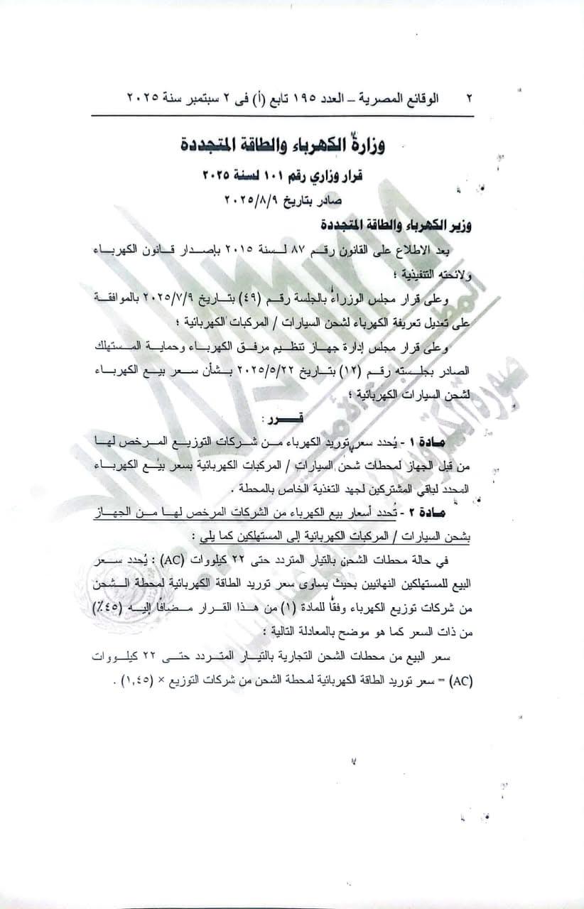 صرح أسامة أبو المجد رئيس رابطة تجار السيارات ان القرار الجديد لشحن السيارات الكهربائية بدأ من 3 سبتمبر في التطبيق مؤكداً ان الكثيرين هاجموا القرار لأنهم طالبوا بضرورة تشجيع التحول للسيارات الكهربائية بدلاً من رفع الأسعار للضعف تقريباً , حيث بلغت الزيادة الجديدة لسعر شحن السيارات الكهربائية للشحن البطيء لسعر الكيلوواط من 1.89 جنيه الي 3.04 جنيه والشحن السريع DC من 3.75 جنيه للكيلو واط الي 6.55 جنيه للكيلوواط.