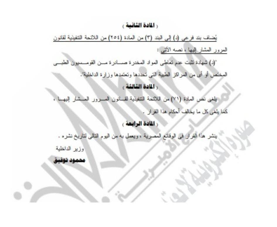 (د) شهادة تثبت عدم تعاطى المواد المخدرة صادرة من القومسيون الطبي المختص أو أي من المراكز الطبية التي تحددها وتعتمدها وزارة الداخلية”.