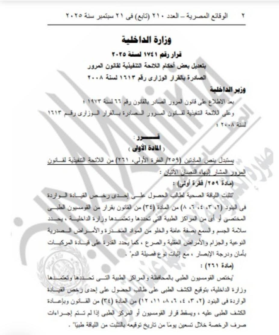 أعلنت وزارة الداخلية المصرية في قرار جديد نشر في الجريدة الرسمية عن قرار وزير الداخلية رقم 1741 لسنة 2025 بتعديل بعض أحكام اللائحة التنفيذية لقانون المرور الصادرة بالقرار الوزاري رقم 1613 لسنة 2008. ونصت المادة الأولى من القرار على أن يستبدل بنص المادتين ( 259/ الفقرة الأولى ، 261 ) من اللائحة التنفيذية لقانون المرور المشار إليها، نصوص جديدة.