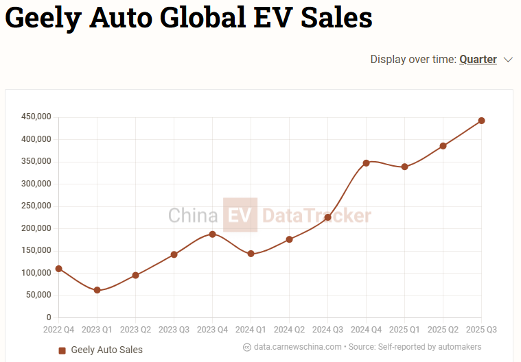 باعت شركة جيلي، أكبر منافس لشركة BYD والتي يشار إليها أحيانًا باسم فولكس فاجن الصينية بسبب العلامات التجارية العديدة التي تديرها، 442,672 سيارة كهربائية (BEV + PHEV) في الربع الثالث، وهو ما يمثل زيادة بنسبة 96.2٪، مدفوعة في المقام الأول بعلامتها التجارية جالاكسي.