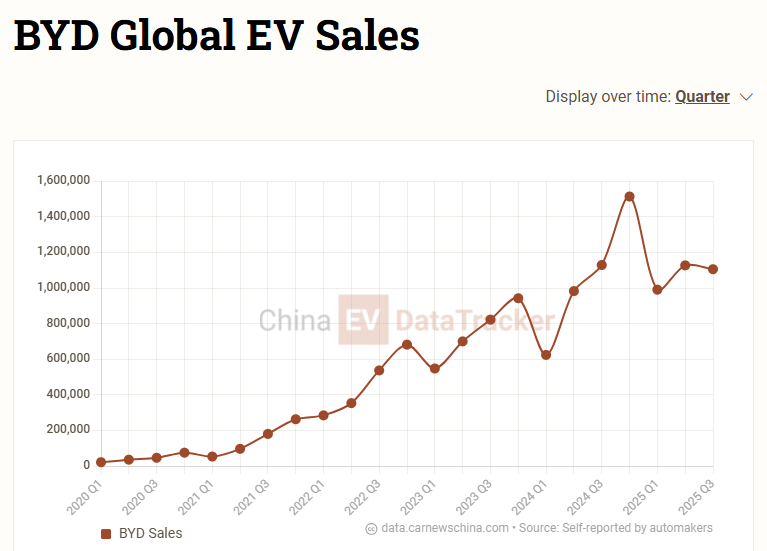 وفي الربع الثالث، باعت مجموعة BYD اجمالي 1,105,591 مركبة عالميًا، بانخفاض 2.1% عن العام الماضي، مسجلةً أول انخفاض ربع سنوي منذ عام 2020. وشهدت علامة BYD انخفاضًا بنسبة 4% عن العام الماضي. وصدرت شركة صناعة السيارات، ومقرها شنتشن، 232,806 وحدة في الربع الثالث، بزيادة قدرها 146.4% عن الفترة نفسها من العام الماضي. وانخفضت مبيعات السيارات الهجينة القابلة للشحن بنسبة 23.7% لتصل إلى 523,069 وحدة، بينما نمت مبيعات السيارات الكهربائية بالكامل بنسبة 31.4% لتصل إلى 582,522 وحدة.