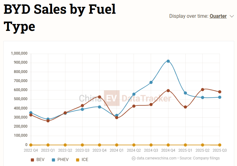 ومن العوامل الحاسمة الأخرى انخفاض مبيعات سيارات BYD الهجينة القابلة للشحن (PHEV). ففي سبتمبر، انخفضت مبيعاتها بنسبة 25.6% لتصل إلى 188,010 وحدات. وقد انخفضت مبيعاتها من هذه السيارات لستة أشهر متتالية منذ أبريل. وما يمنع شركة BYD من الانخفاض الحاد هو ثلاثة عوامل: العلامات التجارية الفرعية الثلاثة الجديدة، ومبيعات المركبات الكهربائية التي تعمل بالبطارية، والمبيعات في الخارج.