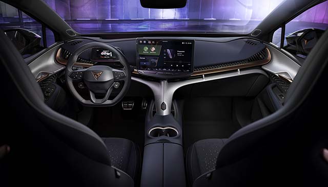 أما المقصورة الداخلية، فهي مميزة بفضل هيكلها المركزي المميز وفتحات التهوية الرفيعة التي تكاد تكون غير مرئية. والتصميم الداخلي جريءٌ ، ويتميز بـ"قسم مركزي" متصل بلوحة القيادة ومغطاةٌ بزخارف شبكية ثلاثية الأبعاد. ويجلس السائق خلف عجلة قيادة مسطحة القاع، ويجد نفسه أمام لوحة عدادات رقمية قياس 5.3 بوصة، مصحوبة بشاشة عرض أمامية بتقنية الواقع المعزز.