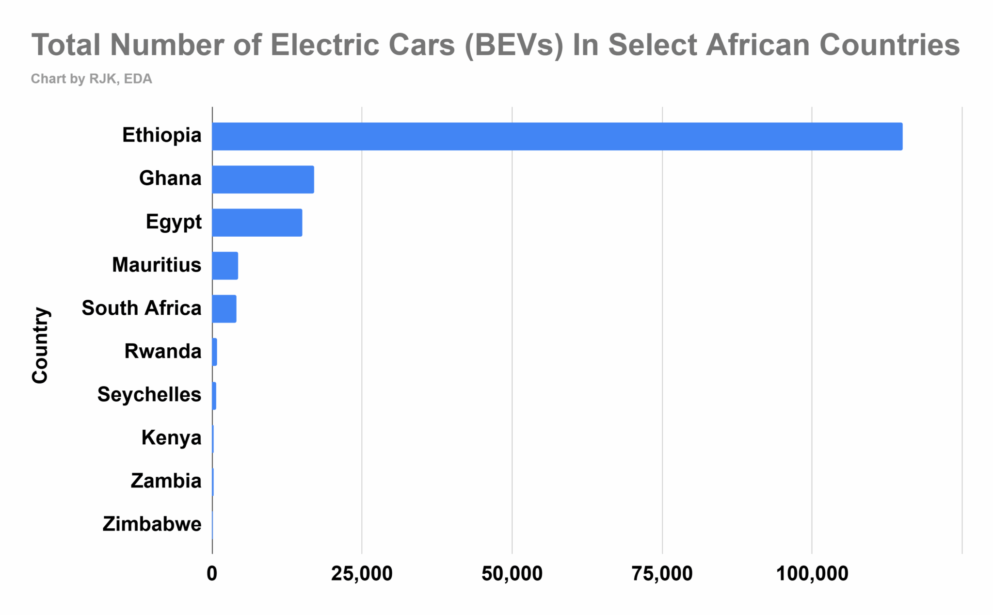 وقدم نظرة على بعض الدول الرائدة في تبني السيارات الكهربائية في القارة الأفريقية, حيث تتصدر القائمة إثيوبيا، بأكثر من 115000 سيارة كهربائية وفقًا لوزارة النقل الإثيوبية، تليها غانا بأكثر من 17000، ثم مصر بأكثر من 15000 وفقًا لتقارير مختلفة.
