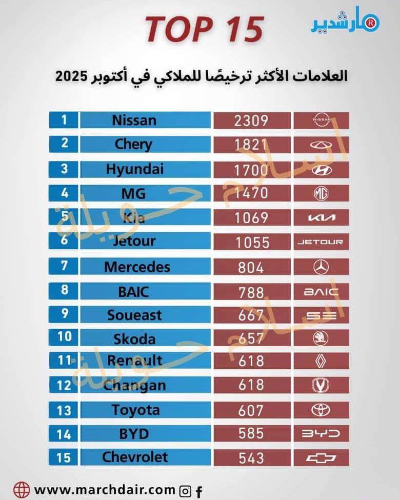 👈الجدول اللي تحت في ترتيب الـ15 علامة في تراخيص اكتوبر، ولو أخدت بالك مفيش أوروبي غير رينو بس الصامدة حتى الآن في مواجهة الصيني والتجميع المحلي.