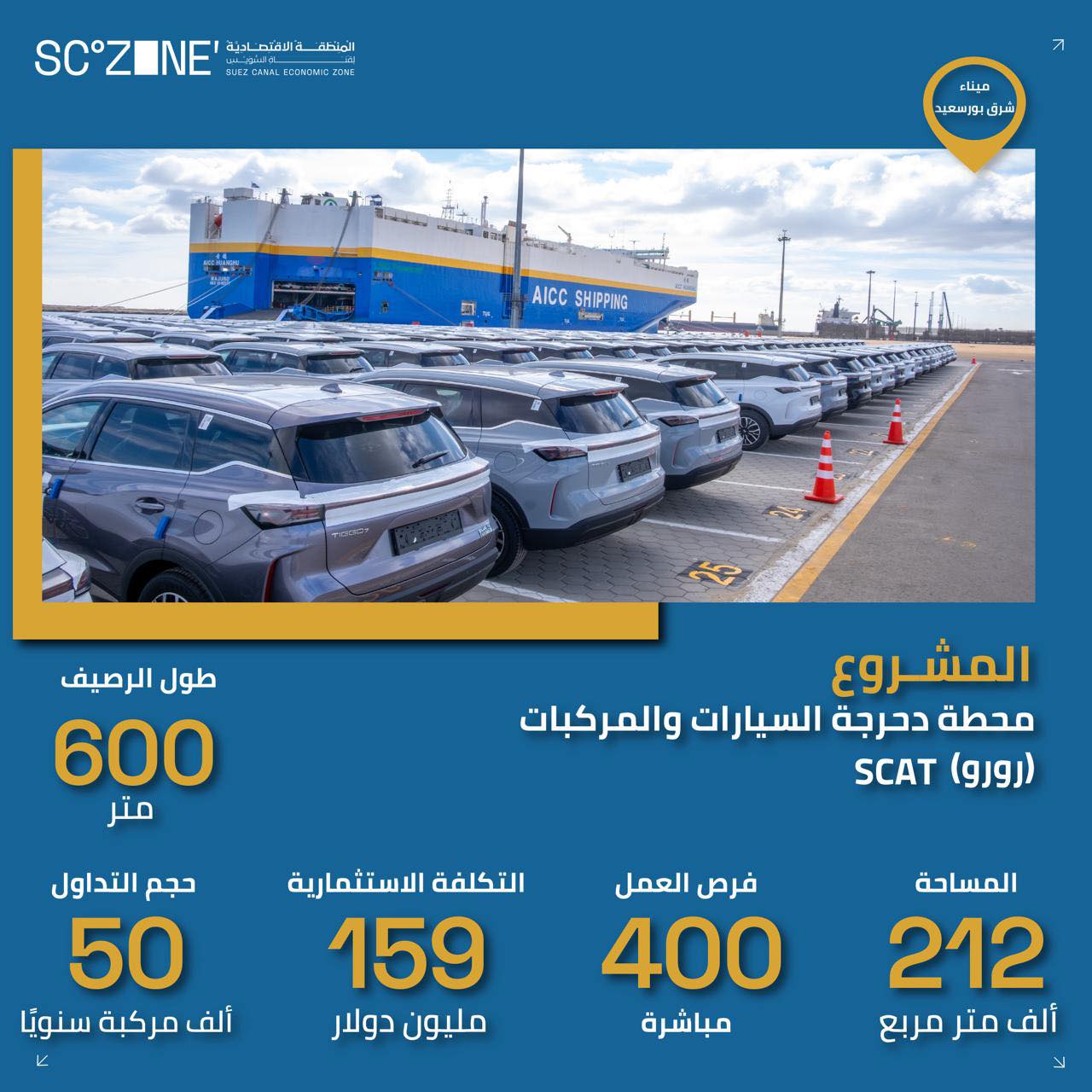 تأتي محطة دحرجة السيارات والمركبات (رورو) SCAT في ميناء شرق بورسعيد التي تم افتتاحها مؤخراً لتشكل إضافة نوعية للبنية اللوجستية، من خلال رصيف بطول 600 متر ومساحة تشغيلية تبلغ 212 ألف متر مربع، وباستثمارات قدرها 159 مليون دولار؛ وذلك في إطار تعزيز قدرات المنطقة الاقتصادية لقناة السويس.