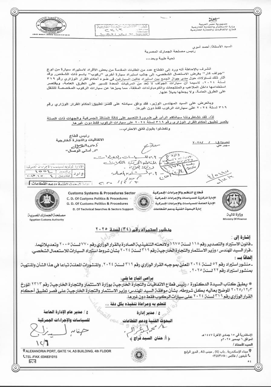 تم الكشف من قبل الجمارك المصرية عن قرار جديد يخص استيراد المركبات. وتم نشر صورة من منشور إستيراد  رقم 34 لسنة 2025 بشأن تطبيق كتاب رئيس قطاع الاتفاقيات والتجارة الخارجية بوزارة الاستثمار والتجارة الخارجية رقم ۲۳۱۳ المؤرخ ۲۰۲٥/١٢/٣ الموضح بكل شروطه، بشأن موافقة وزير الاستثمار والتجارة الخارجية على قصر تطبيق أحكام القرار الوزاري رقم ٣١٩ لسنة ٢٠٢٤ على سيارات الركوب فقط دون غيرها مع ضرورة التعميم علي كافة المنافذ الجمركية والجهات ذات الصلة بقصر تطبيق أحكام القرار رقم 319 لعام 2024 علي سيارات الركوب فقط دون غيرها.