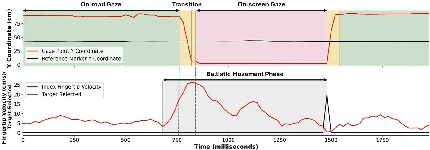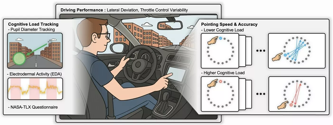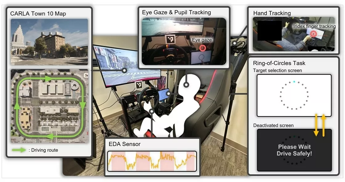 وقد تم وضع ستة عشر مشاركًا في جهاز محاكاة قيادة عالي الدقة بينما قام الباحثون بتتبع حركات العين واليد، وتوسع حدقة العين، وموصلية الجلد. وطلب من السائقين التفاعل مع شاشة لمس السيارة وإكمال مهام تعتمد على الذاكرة مصممة لقياس الجهد الذهني. وقد وفر حجم حدقة العين والاستجابة الجلدية الكهربائية بيانات أساسية حول مدى الجهد الذي يبذله الدماغ. باختصار، عندما طلب من السائقين أداء مهام روتينية على شاشة اللمس أثناء القيادة في بيئة حضرية افتراضية، تراجعت قدرتهم على القيادة ودقتهم على الشاشة بشكل ملحوظ. وكلما زادت صعوبة المهمة، انخفض الأداء أكثر.