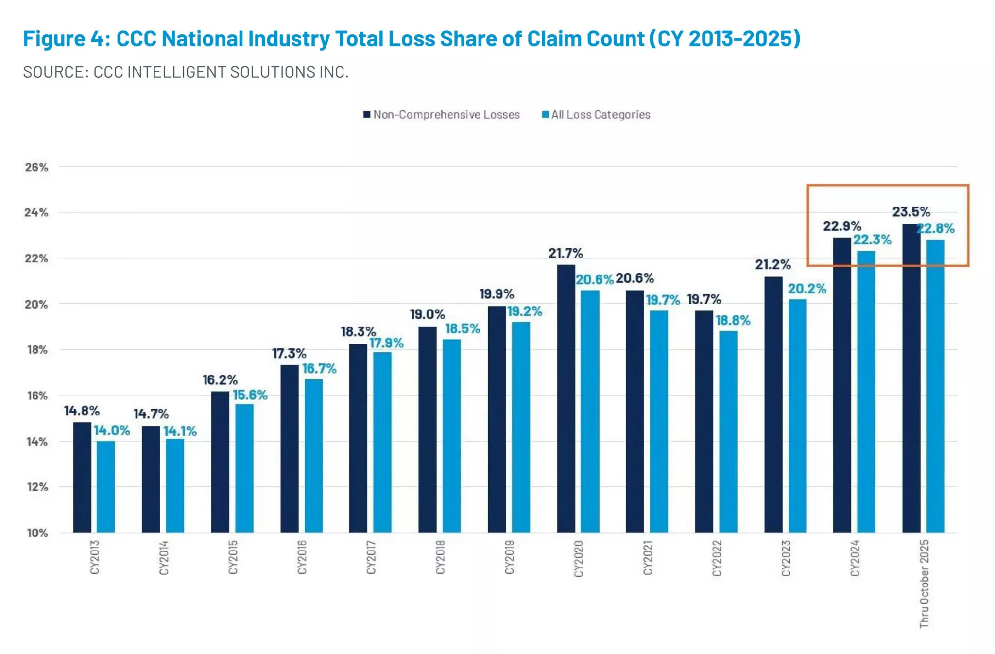 وفقًا لتقرير صادر عن مؤسسة CCC في الولايات المتحدة لهذا العام، فإن الصناعة تواجه ارتفاعًا في معدل الخسائر الكلية، والذي تشكل بفعل التغيرات طويلة الأجل في كل من تصميم المركبات وسلوك المستهلك. وتعتبر واحدة من كل أربع سيارات تقريبًا تتعرض لحادث تصادم خسارة كلية، وتتزايد هذه النسبة. هذه هي الخلاصة الرئيسية للدراسة التي أجرتها شركة CCC، والتي ترصد بيانات إصلاح حوادث التصادم والمطالبات في هذا القطاع في بعض الولايات المتحدة. وتشير التقارير إلى أن معدل الخسائر الإجمالية ارتفع من 22.1% في عام 2024 إلى 22.8% في عام 2025، أي بزيادة قدرها 0.7 نقطة مئوية. ولا يعود السبب إلى سوء القيادة أو أنظمة القيادة الذاتية غير المراقبة.