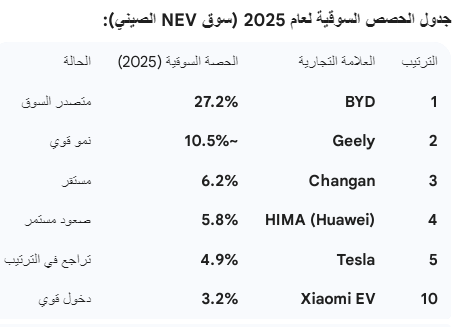 كشفت أحدث البيانات الصادرة عن جمعية سيارات الركاب الصينية (CPCA) لعام 2025 عن تغييرات جوهرية في خريطة سوق سيارات الطاقة الجديدة (NEV)، حيث أحكمت الشركات المحلية قبضتها على السوق، في حين واجهت العلامات التجارية الكبرى مثل "تيسلا" تحديات قاسية أدت لتراجع حصتها السوقية.