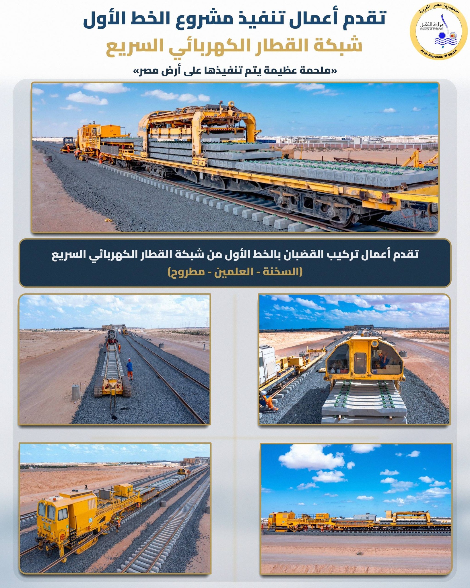 جرت خلال الساعات الماضية جولة تفقدية لمشروع القطار الكهربائي السريع من قبل وزير النقل المصري . وتابع مواقع العمل بالخط الأول من شبكة القطار الكهربائي السريع السخنة – العلمين - مطروح بطول 660 كم. ويدخل المشروع ضمن الممر اللوجستي السخنة - الدخيلة ، وذلك في المسافة من أكتوبر حتى برج العرب . وجرت متابعة أعمال التقدم في معدلات التنفيذ بالمشروع التي تشمل :