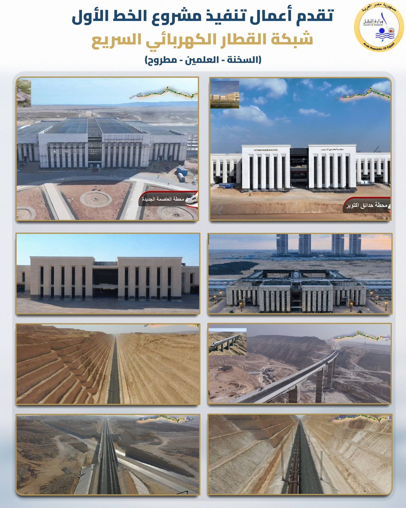 كما يشتمل القطاع على عدد 26 كوبرى تقاطع مع مسار القطار الكهربائى السريع  مثل (البوليفارد - 6 أكتوبر الزراعية – الكتيبة – الضبعة – سفنكس – الدائرى الاقليمى –قرية طنمبول - قرية بني سلامة - قرية الحمرا - الطبراني - الشجاعة - بداية النوبارية – نهاية النوبارية وغيرهم . كما تابع عدد 2 نفق . وتفقد الوزير اعمال الانتهاء من اعمال الجسور لمسار القطار السريع لأغلب المسار طوال مسار الزيارة وتسليمها للتحالف لبدء فرد البازلت والفلنكات واعمال السكة كاملة .
