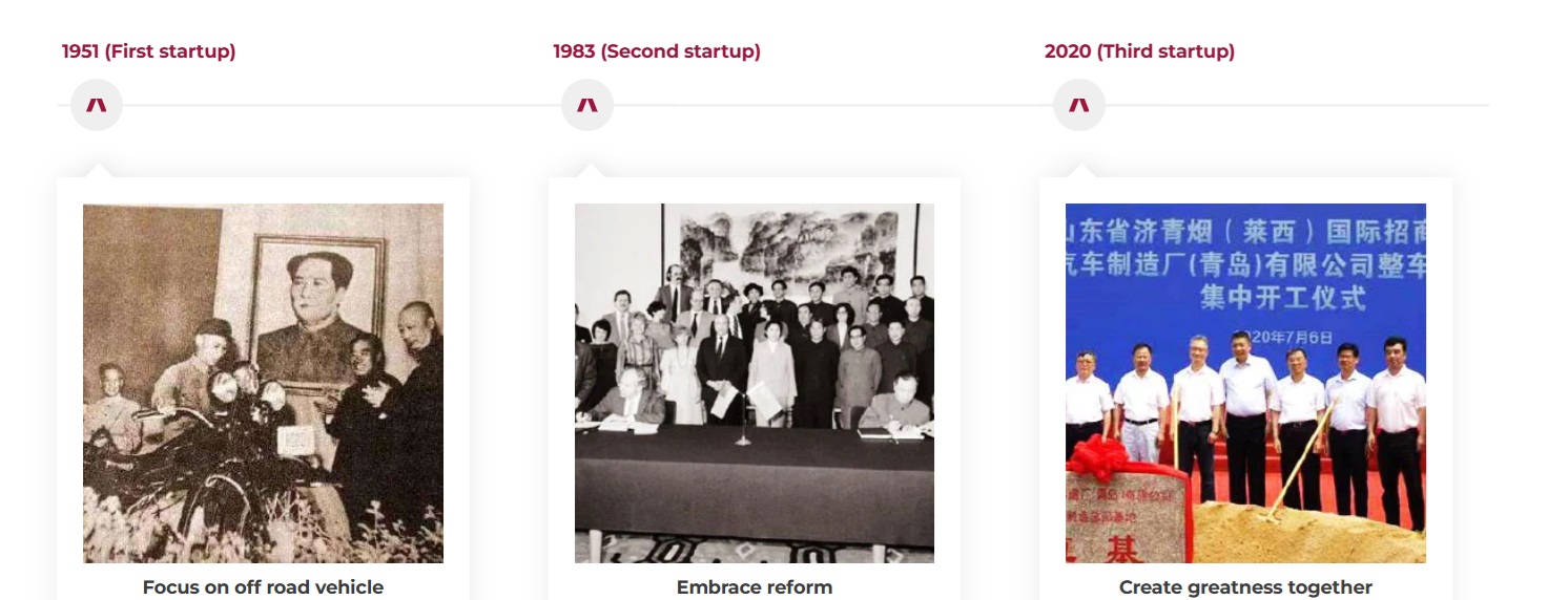 وبدأت الشركة مسارها بسيارات عسكرية باسم BJ212 حيث باعت منها 2.4 مليون نسخة خلال 56 عام . وتبعتها BJ2020 وBJ2023 وBJ2032 , وهي سلسلة مركبات مخصصة للطرق الوعرة .