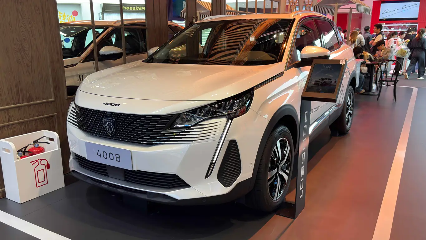سيارة بيجو 4008، المعروضة بجانبها، هي طراز أصغر حجماً. تتميز بتصميم خارجي عصري مع شبكة أمامية جديدة وإضاءة داخلية أنيقة. أما من الداخل، فتضم لوحة عدادات رقمية، وشاشة عرض مركزية للوسائط المتعددة، وتصميم i-Cockpit الخاص بالعلامة التجارية مع عجلة قيادة صغيرة الحجم.