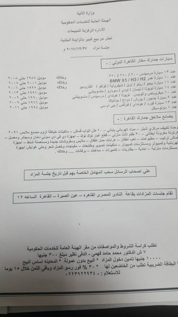 حصري: صور وماركات وموديلات مزاد "جمارك مطار القاهرة "يوم 27 الجارى
